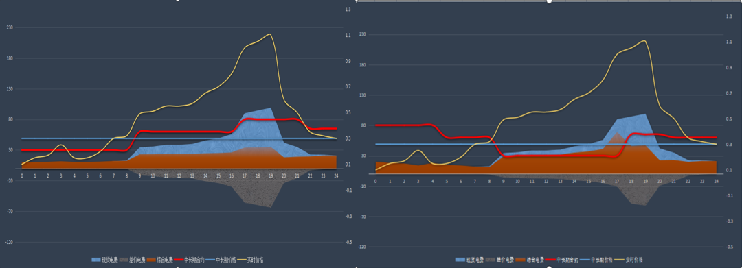 當市場來臨的時候,部分國有發(fā)電企業(yè)的經(jīng)營模式并沒有調(diào)整到位,可能存在經(jīng)營決策失誤的原因。例如,中長期簽約時未充分考慮自身節(jié)點和用戶側(cè)現(xiàn)貨價格的差異,不同發(fā)電企業(yè)、不同用戶一個策略,簡單粗暴,不管簽哪的用戶都是一個價,只重視合同價格的高低,不考慮價差電費的高低,有些甚至不在合同中約定分時價格。如圖4所示,左圖與右圖用戶電量相同,左圖用戶合同價為0.4元/度,右圖用戶合同價為0.3元/度,兩個用戶用電曲線形狀不同,其他均相同。從大烏海區(qū)域部分電源的選擇來看,顯然更喜歡左圖用戶,然而事實卻告訴我們:由于右圖用戶價差電費要遠高于左圖用戶的價差電費,最終的結(jié)算結(jié)果是合同價低25%的右圖用戶可以為電源帶來的電費(紅色部分)高于左圖用戶。