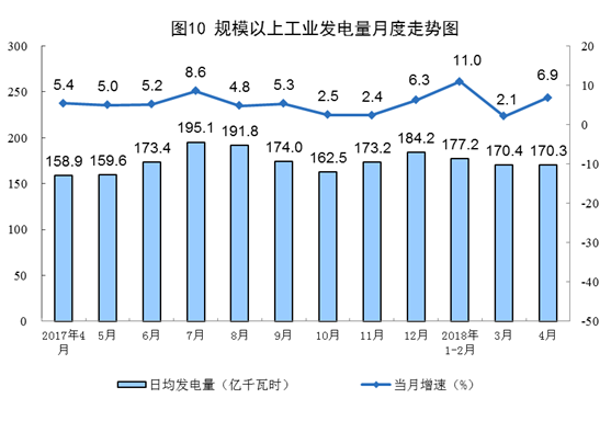 分品種看,火電增速加快,水電降幅收窄。4月份,火電增長7.3%,增速比上月加快5.9個百分點;水電下降2.6%,降幅收窄2.7個百分點;核電增長6.5%,加快4.8個百分點;風電、太陽能發(fā)電保持兩位數(shù)高增長,分別增長22.6%、26.4%。
