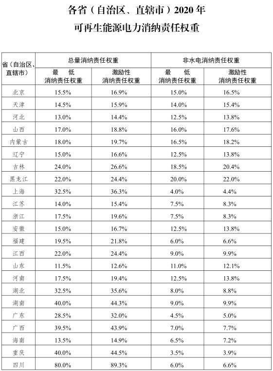 根據(jù)《國家發(fā)展改革委 國家能源局關(guān)于建立健全可再生能源電力消納保障機(jī)制的通知》(發(fā)改能源〔2019〕807號),在各地測算的基礎(chǔ)上,我們統(tǒng)籌提出了各省級行政區(qū)域2020年可再生能源電力消納責(zé)任權(quán)重,現(xiàn)印發(fā)你們,請認(rèn)真組織落實(shí)。