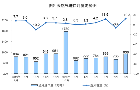 天然氣進(jìn)口增速由負(fù)轉(zhuǎn)正。8月份,進(jìn)口天然氣936萬噸,同比增長12.3%,上月為下降6.4%。1—8月份,進(jìn)口天然氣6507萬噸,同比增長3.3%。