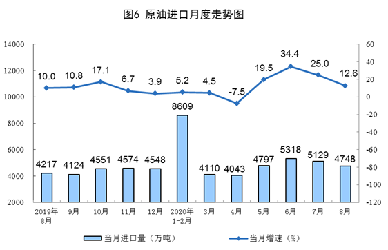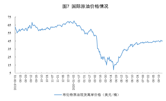 原油進(jìn)口增速回落,國際原油價(jià)格小幅上漲。8月份,進(jìn)口原油4748萬噸,同比增長12.6%,增速比上月回落12.4個(gè)百分點(diǎn)。1—8月份,進(jìn)口原油3.7億噸,同比增長12.1%。8月28日布倫特原油現(xiàn)貨離岸價(jià)格為45.22美元/桶,比7月31日的43.13美元/桶上漲4.8%。