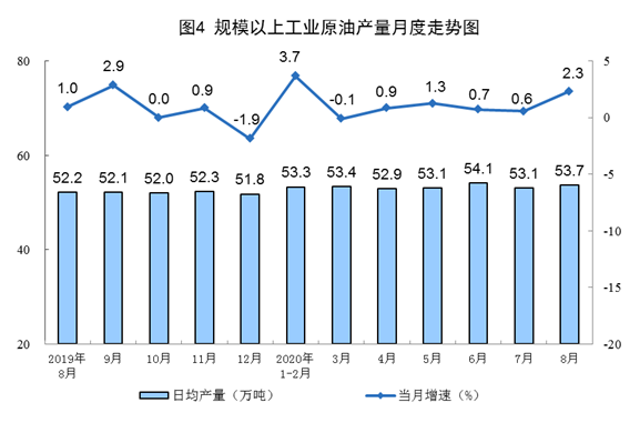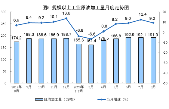 原油生產(chǎn)加快,加工有所放緩。8月份,生產(chǎn)原油1665萬噸,同比增長2.3%,增速比上月加快1.7個(gè)百分點(diǎn);加工原油5947萬噸,增長9.2%,比上月放緩3.2個(gè)百分點(diǎn)。1—8月份,生產(chǎn)原油13015萬噸,同比增長1.5%;加工原油4.4億噸,同比增長3.2%。