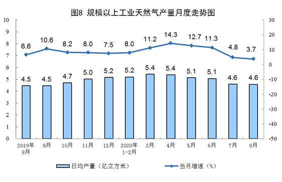 天然氣生產(chǎn)有所放緩。8月份,生產(chǎn)天然氣142億立方米,同比增長3.7%,增速比上月放緩1.1個(gè)百分點(diǎn);日均產(chǎn)量4.6億立方米,與上月持平。1—8月份,生產(chǎn)天然氣1225億立方米,同比增長8.8%。