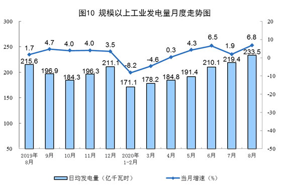 電力生產(chǎn)較快增長。8月份,發(fā)電量7238億千瓦時(shí),同比增長6.8%,增速比上月加快4.9個(gè)百分點(diǎn);日均發(fā)電量233.5億千瓦時(shí),環(huán)比增加14.1億千瓦時(shí)。1—8月份,發(fā)電量47728億千瓦時(shí),同比增長0.3%。