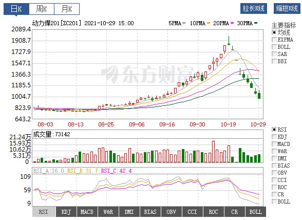 10月28日,受政策監(jiān)管沖擊,煤炭股市、期貨市場延續(xù)跌勢,煤炭概念跳水跌超6%,兗州煤業(yè)( 600188.SH )等多股跌停。商品期貨方面,動(dòng)力煤跌2.25%,而在此之前的幾個(gè)交易日,以鄭商所動(dòng)力煤為例,其價(jià)格直接攔腰斬?cái)啵瑥?0月19日每噸1982元高點(diǎn)直落至10月28日夜間收市的1041元。
