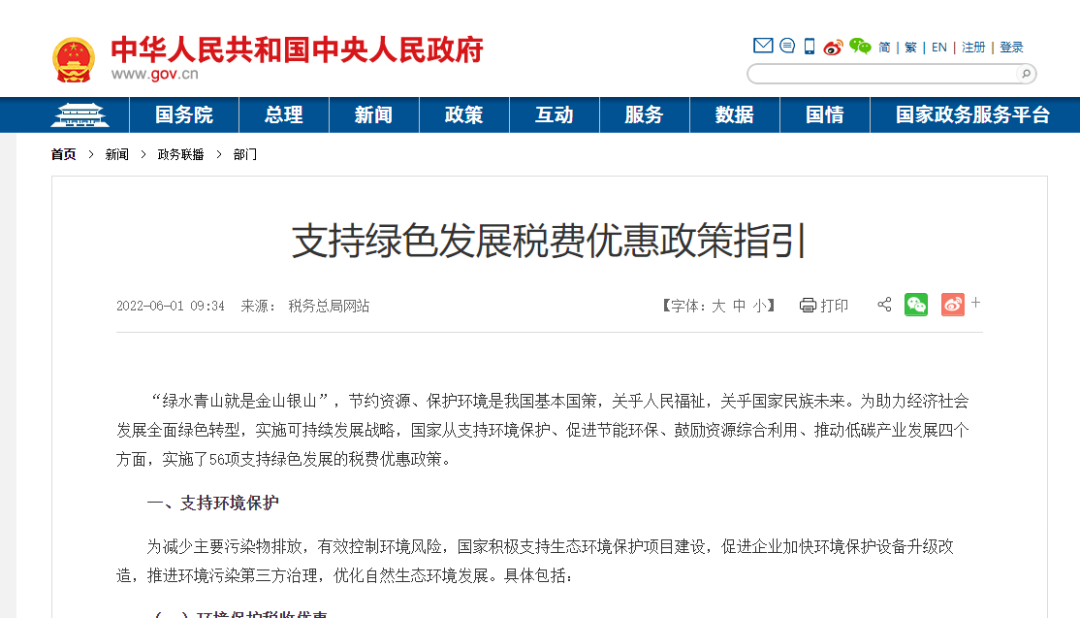 為著眼于國家碳達峰碳中和戰(zhàn)略部署,充分體現(xiàn)稅收對市場主體綠色低碳發(fā)展的促進和激勵作用,國家稅務總局日前發(fā)布《支持綠色發(fā)展稅費優(yōu)惠政策指引》,從支持環(huán)境保護、促進節(jié)能環(huán)保、鼓勵資源綜合利用、推動低碳產業(yè)發(fā)展四個方面,實施了56項支持綠色發(fā)展的稅費優(yōu)惠政策。