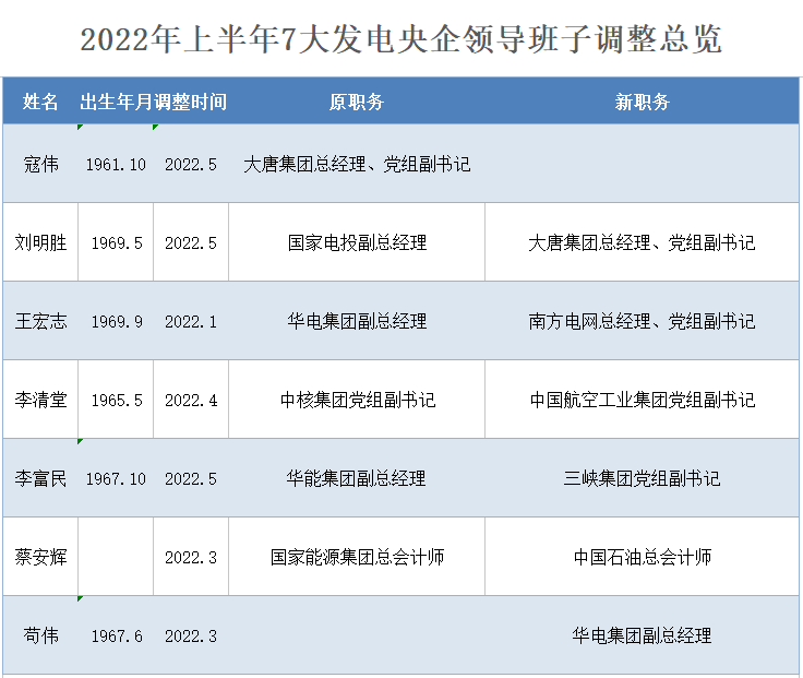 本文改編自能見公眾號,原標題《領導去哪兒:7家發(fā)電央企領導班子上半年調(diào)整與下半年展望》。