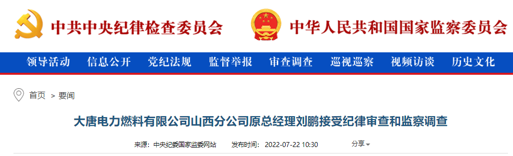 中央紀委國家監(jiān)委網(wǎng)站7月22日消息,據(jù)中國大唐集團有限公司紀檢監(jiān)察組、山西省監(jiān)察委員會消息:大唐電力燃料有限公司山西分公司原總經(jīng)理劉鵬涉嫌嚴重違紀違法,目前正接受中國大唐集團有限公司紀檢監(jiān)察組紀律審查和山西省太原市監(jiān)察委員會監(jiān)察調(diào)查。