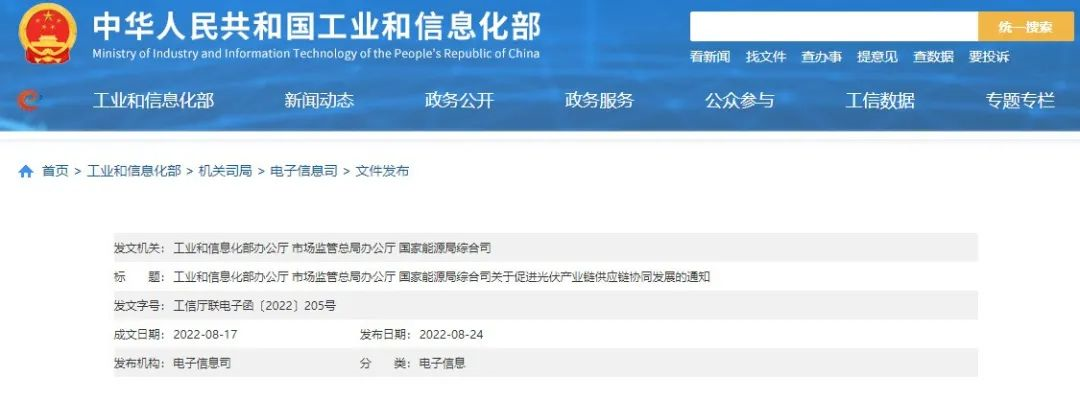 本網訊 8月24日,工信部辦公廳、市場監(jiān)管總局辦公廳、國家能源局綜合司發(fā)布《三部門關于促進光伏產業(yè)鏈供應鏈協(xié)同發(fā)展的通知》。