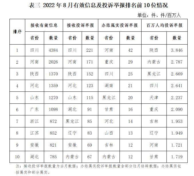 各省(自治區(qū)、直轄市)按照接收的有效信息數(shù)量排序,四川、河南、陜西、河北、山東、廣東、浙江、江蘇、安徽、湖北排在全國(guó)前10位;按照接收的投訴舉報(bào)數(shù)量排序,四川、河南、陜西、河北、山東、湖北、黑龍江、遼寧、安徽、內(nèi)蒙古排在全國(guó)前10位;按照辦結(jié)屬實(shí)的投訴舉報(bào)數(shù)量排序,河南、重慶、四川、湖南、黑龍江、甘肅、河北、山西、吉林、內(nèi)蒙古排在全國(guó)前10位;按照百萬(wàn)人均投訴舉報(bào)數(shù)量排序,陜西、內(nèi)蒙古、黑龍江、四川、天津、重慶、吉林、遼寧、河南、甘肅排在全國(guó)前10位。(2022年8月有效信息及投訴舉報(bào)排名前10位情況見表三)