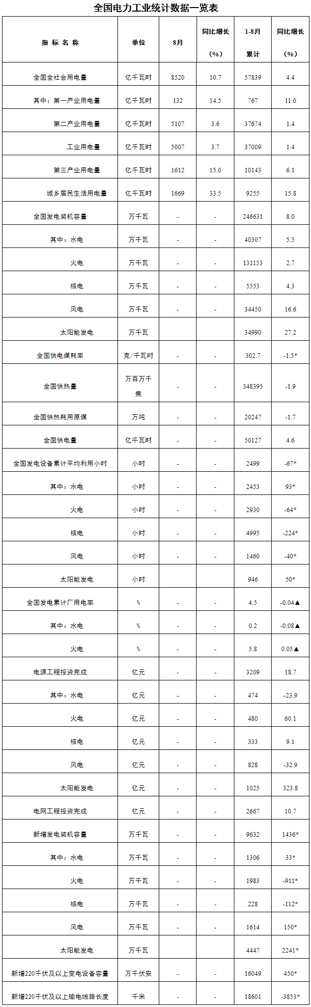 注:1.全社會(huì)用電量為全口徑數(shù)據(jù),全國供電量為調(diào)度口徑數(shù)據(jù)。2.“同比增長”列中,標(biāo)*的指標(biāo)為絕對(duì)量;標(biāo)▲的指標(biāo)為百分點(diǎn)。
