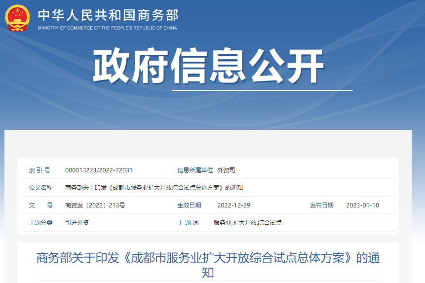 商務(wù)部關(guān)于印發(fā)《成都市服務(wù)業(yè)擴(kuò)大開放綜合試點總體方案》的通知