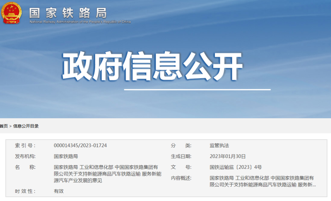 國(guó)家鐵路局 工業(yè)和信息化部 中國(guó)國(guó)家鐵路集團(tuán)有限公司關(guān)于支持新能源商品汽車(chē)鐵路運(yùn)輸 服務(wù)新能源汽車(chē)產(chǎn)業(yè)發(fā)展的意見(jiàn)