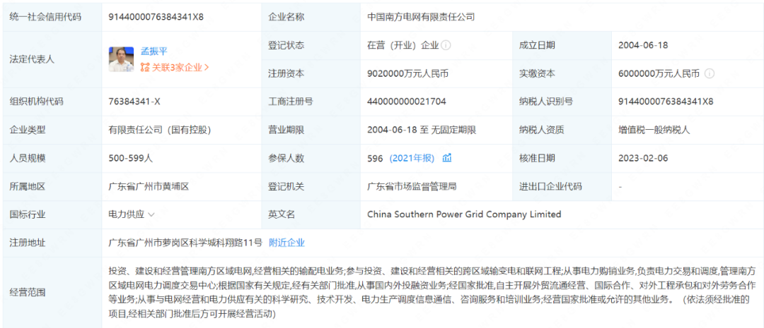 2月6日,中國南方電網(wǎng)有限責(zé)任公司發(fā)生工商變更。