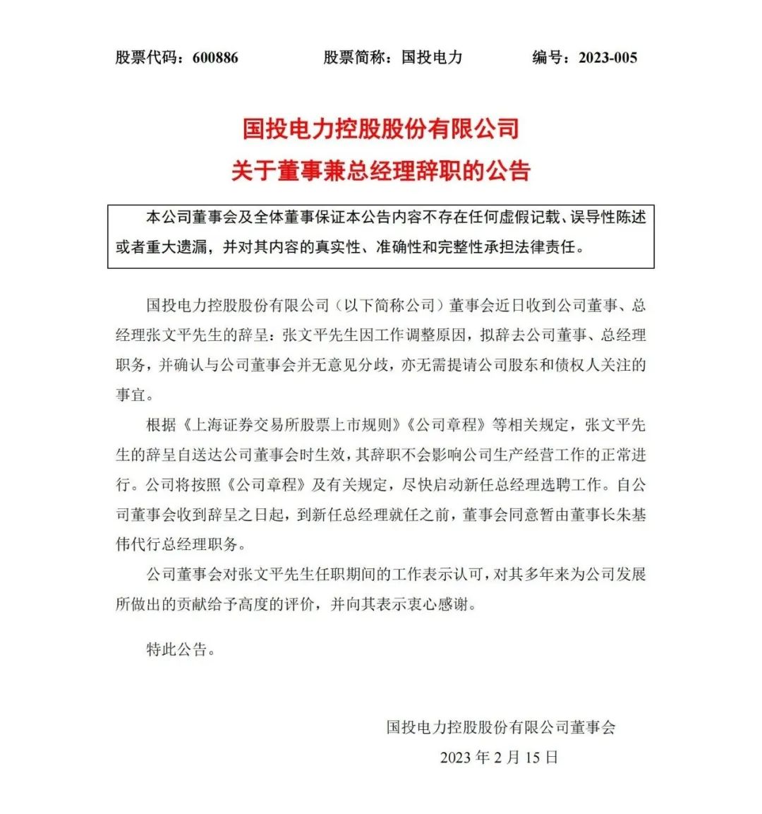 國(guó)投電力發(fā)布關(guān)于董事兼總經(jīng)理辭職的公告。