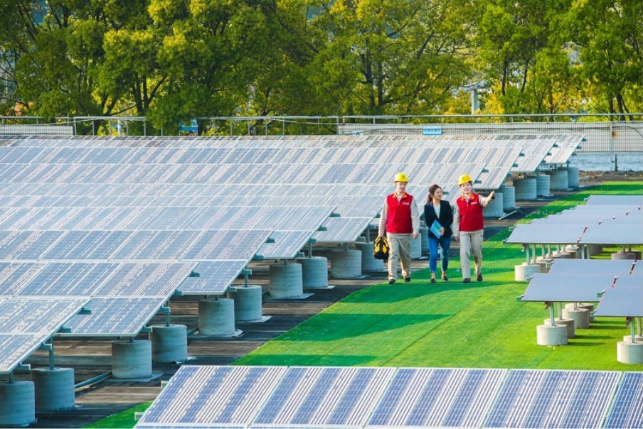 國(guó)網(wǎng)上海電力員工在光伏項(xiàng)目現(xiàn)場(chǎng)為客戶(hù)講解維護(hù)事宜。