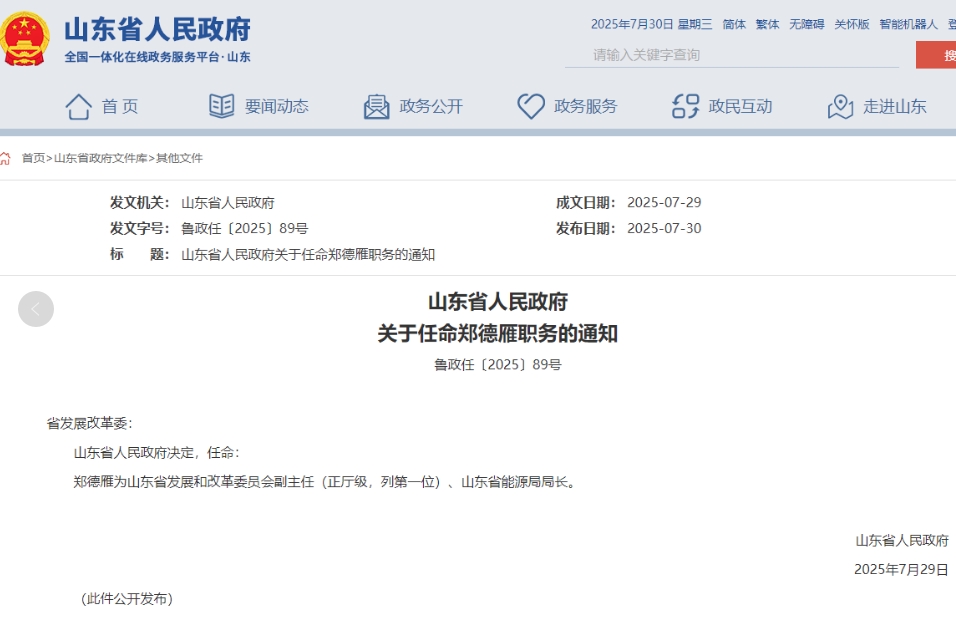 7月30日,山東省人民政府發(fā)布關(guān)于任命鄭德雁職務(wù)通知。任命鄭德雁為山東省發(fā)展和改革委員會(huì)副主任(正廳級(jí),列第一位)、山東省能源局局長(zhǎng)。
