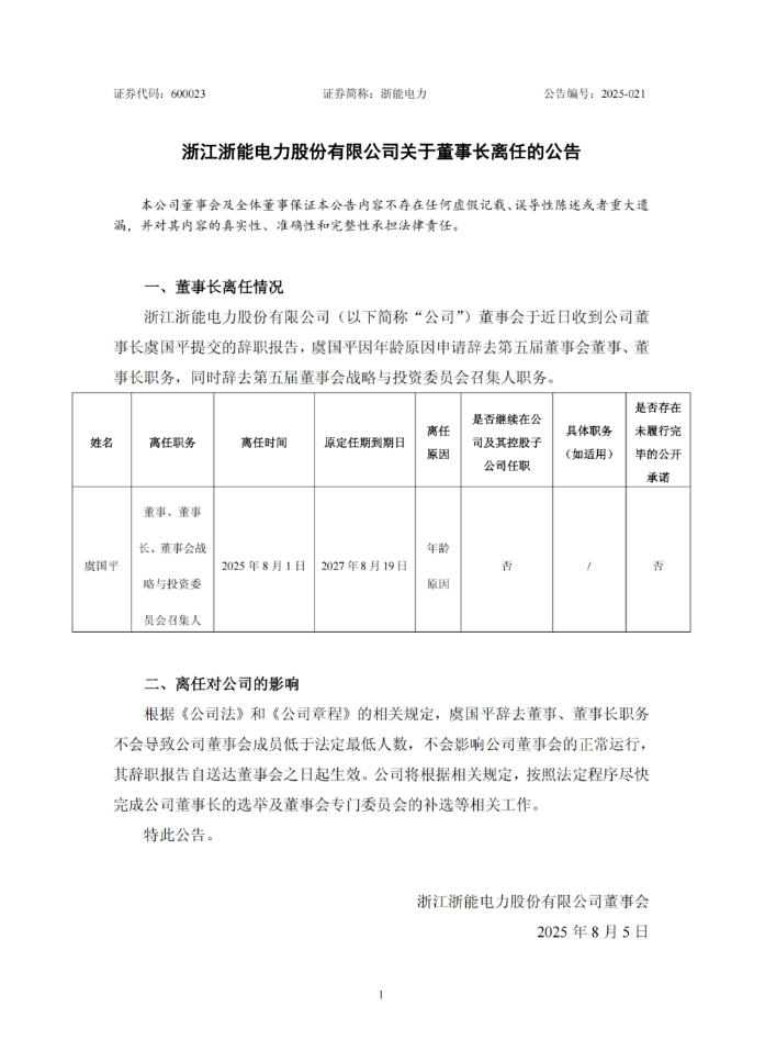董事長(zhǎng)虞國(guó)平因年齡原因申請(qǐng)辭去第五屆董事會(huì)董事及董事長(zhǎng)職務(wù),離任時(shí)間為2025年8月1日,原定任期到期日為2027年8月19日。