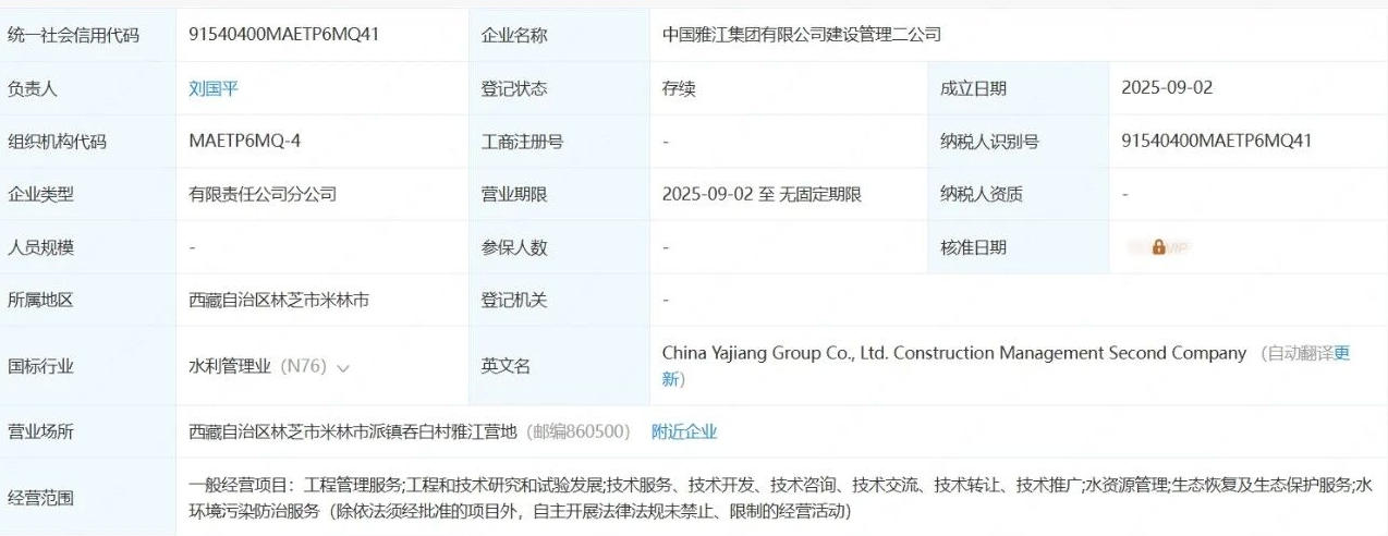 中國雅江集團有限公司建設(shè)管理一公司、二公司相繼成立。中國雅江集團有限公司建設(shè)管理一公司,負責人:王毅,統(tǒng)一社會信用代碼為91540400MAEW7D3D0Y,企業(yè)注冊地址位于西藏自治區(qū)林芝市米林市米林鎮(zhèn)邦仲村華發(fā)(林芝)航空商貿(mào)旅游小鎮(zhèn)內(nèi)一期B區(qū)會展中心2層B201—B216號,所屬行業(yè)為水利管理業(yè)。