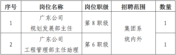 根據(jù)工作需要,依據(jù)公司招聘管理相關(guān)規(guī)定,現(xiàn)對廣東公司(海外公司)規(guī)劃發(fā)展部主任等兩個崗位進行公開招聘。