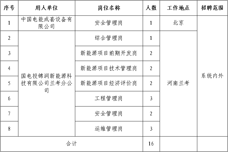 為加快推進(jìn)公司新興產(chǎn)業(yè)落地,保障各項(xiàng)經(jīng)營(yíng)管理工作有序開展,根據(jù)相關(guān)所屬企業(yè)用人實(shí)際,面向國(guó)家電投集團(tuán)系統(tǒng)內(nèi)、外公開選聘專業(yè)技術(shù)人員共16名?,F(xiàn)將有關(guān)事項(xiàng)公告如下:
