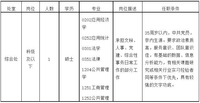 綜合處主任科員及以下崗位1人(京內(nèi)生源的碩士應(yīng)屆畢業(yè)生)。35周歲以內(nèi),中共黨員,要求政治素質(zhì)高,服務(wù)意識、團隊意識佳,有基礎(chǔ)的數(shù)據(jù)、信息分析能力,同等條件下有相關(guān)課題研究或相關(guān)行業(yè)實習(xí)經(jīng)驗者優(yōu)先,具有較強的文字功底。具體要求詳見下表。