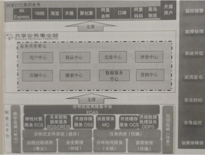 業(yè)務(wù)中臺(tái)最早是阿里集團(tuán)提出,是從淘寶、天貓系統(tǒng)中將共性的商品管理、交易管理、店鋪管理、評(píng)價(jià)管理等業(yè)務(wù)能力抽象形成業(yè)務(wù)中臺(tái),如圖所示: