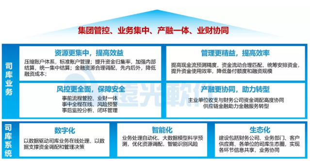 結(jié)合集團(tuán)企業(yè)發(fā)展需求和業(yè)界實踐經(jīng)驗,司庫管理體系建設(shè)需滿足“資源更集中、管理更精益、風(fēng)控更全面、產(chǎn)融更協(xié)同”四個標(biāo)準(zhǔn),以數(shù)字化、智能化的司庫管理信息系統(tǒng)為支撐,以“集團(tuán)管控、業(yè)務(wù)集中、產(chǎn)融一體、業(yè)務(wù)協(xié)同”為管理目標(biāo)。