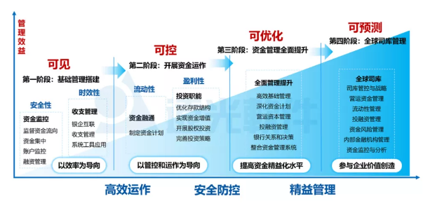 司庫管理注重強(qiáng)化營運(yùn)資金、流動性、資本結(jié)構(gòu)、利率匯率風(fēng)險和融資的管控,通過司庫體系建設(shè),企業(yè)可將資金被動管理轉(zhuǎn)變?yōu)橹鲃庸芾?、超前管理,實現(xiàn)集團(tuán)各類金融資源可視、可控和增值,成為集團(tuán)戰(zhàn)略落地的堅實保障。
