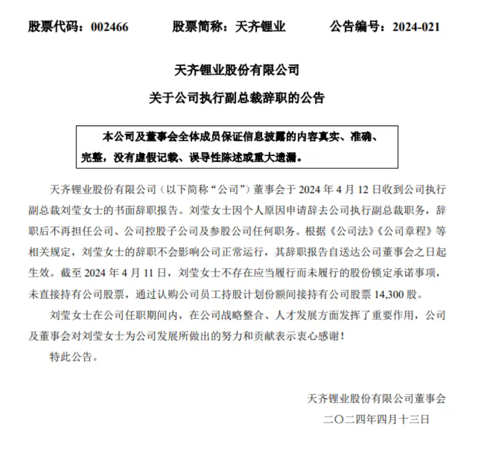 天齊鋰業(yè)發(fā)布公告稱(chēng),公司董事會(huì)于4月12日收到公司執(zhí)行副總裁劉瑩女士的書(shū)面辭職報(bào)告。劉瑩女士因個(gè)人原因申請(qǐng)辭去公司執(zhí)行副總裁職務(wù) ,辭職后不再擔(dān)任公司、公司控股子公司及參股公司任何職務(wù)。根據(jù)《公司法》《公司章程》等相關(guān)規(guī)定,劉瑩女士的辭職不會(huì)影響公司正常運(yùn)行,其辭職報(bào)告自送達(dá)公司董事會(huì)之日起生效。
