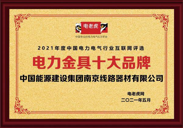 近日,中國(guó)能源建設(shè)集團(tuán)南京線路器材有限公司參與了2021年度中國(guó)電力電氣行業(yè)“十大品牌”系列評(píng)選活動(dòng),榮獲“電力金具十大品牌”稱號(hào)。