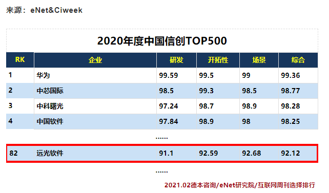 近日,中國科學院《互聯(lián)網(wǎng)周刊》、eNet研究院、德本咨詢聯(lián)合發(fā)布了“2020年度中國信創(chuàng)TOP500”,遠光軟件憑借在企業(yè)管理、能源互聯(lián)等信息化領域的多年實踐積累和技術創(chuàng)新,進入榜單前100名,排名第82位。
