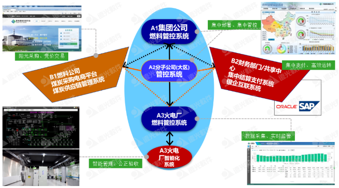 在縱向貫通方面,通過在集團(tuán)公司總部部署燃料管控信息系統(tǒng),以集中部署、集中管控為實(shí)施原則,發(fā)揮集團(tuán)公司的計(jì)劃管理和實(shí)施監(jiān)督的管理職能。在分(子)公司部署燃料管控系統(tǒng),作為燃料縱向三級管控中承上啟下的“橋梁”,對下屬電廠采購、入廠、結(jié)算實(shí)施監(jiān)管,同時(shí)進(jìn)行區(qū)域內(nèi)調(diào)控;協(xié)助集團(tuán)公司進(jìn)行保供控價(jià)的執(zhí)行,落實(shí)集團(tuán)對燃料指標(biāo)管控要求。在電廠部署燃料管控信息系統(tǒng)(A2)與燃料智能化系統(tǒng)(A3),作為燃料管控的執(zhí)行主體,內(nèi)容包括入廠計(jì)量過程智能化系統(tǒng)、采制樣過程智能化系統(tǒng)、化驗(yàn)管理網(wǎng)絡(luò)化系統(tǒng)、煤場管理數(shù)字化系統(tǒng)、入爐煤管理系統(tǒng)、門禁系統(tǒng)、燃料集中監(jiān)控系統(tǒng)和監(jiān)控中心、燃料業(yè)務(wù)管理系統(tǒng)。
