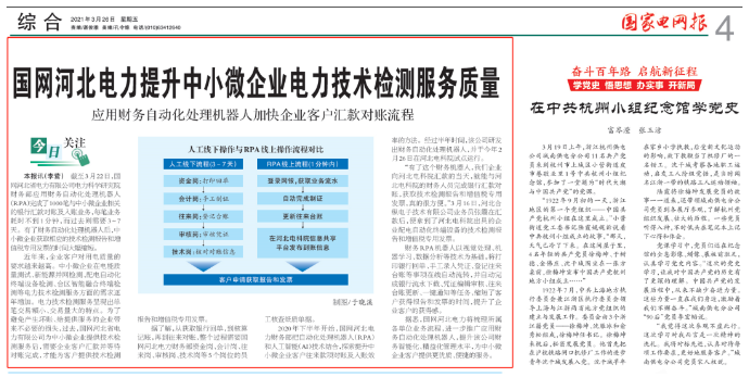 截至3月22日,國(guó)網(wǎng)河北省電力有限公司電力科學(xué)研究院財(cái)務(wù)部應(yīng)用財(cái)務(wù)自動(dòng)化處理機(jī)器人(RPA) 完成了1000筆與中小微企業(yè)相關(guān)的銀行匯款對(duì)賬及入賬業(yè)務(wù),每筆業(yè)務(wù)耗時(shí)不到1分鐘,而過(guò)去則需要3~7天。有了財(cái)務(wù)自動(dòng)化處理機(jī)器人后,中小微企業(yè)獲取相應(yīng)的技術(shù)檢測(cè)報(bào)告和增值稅專(zhuān)用發(fā)票的時(shí)間大幅縮短。