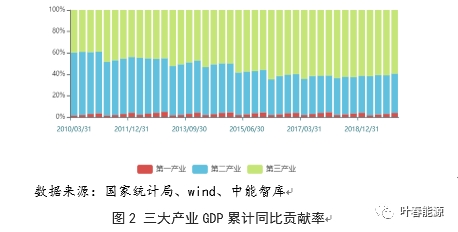 分產(chǎn)業(yè)看,10余年來,隨著我國經(jīng)濟(jì)結(jié)構(gòu)的轉(zhuǎn)型,三大產(chǎn)業(yè)對GDP的貢獻(xiàn)率發(fā)生明顯變化。2010至2019年,第三產(chǎn)業(yè)GDP貢獻(xiàn)率由39.7%上升至59.4%,增加接近20個百分點(diǎn);第二產(chǎn)業(yè)GDP貢獻(xiàn)率由58.6%降至36.8%,下降21.8個百分點(diǎn)。三大產(chǎn)業(yè)貢獻(xiàn)率格局基本穩(wěn)定,第三產(chǎn)業(yè)成為拉動GDP的生力軍,其占比上升5.7個百分點(diǎn);二產(chǎn)占比下降6.6個百分點(diǎn)。2019年,第三產(chǎn)業(yè)和城鄉(xiāng)居民生活用電量對全社會用電量增長的貢獻(xiàn)率達(dá)51.0%,比上年提高11.1個百分點(diǎn),其中第三產(chǎn)業(yè)貢獻(xiàn)率比上年提高10.1個百分點(diǎn),是支撐全社會用電量增長的主要動力。