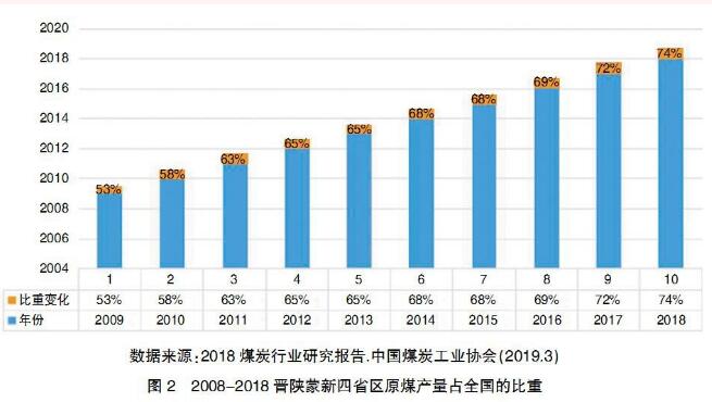 在供給側(cè)結(jié)構(gòu)性改革政策的推動(dòng)下,煤炭產(chǎn)能集中度進(jìn)一步提高。十八大以來(lái),國(guó)務(wù)院相繼出臺(tái)了關(guān)于深化煤炭市場(chǎng)化改革的一系列文件,增大了煤炭去產(chǎn)能力度,截至到2018年底,基本上提前完成了“十三五”煤炭去產(chǎn)能8億噸的計(jì)劃,淘汰關(guān)閉了一大批不合標(biāo)準(zhǔn)的煤礦。同時(shí),為了滿足日益增長(zhǎng)的能源市場(chǎng)需要,新建、擴(kuò)建、技改一批現(xiàn)代化礦井,產(chǎn)能已達(dá)到14.96億噸。據(jù)中國(guó)煤炭工業(yè)協(xié)會(huì)統(tǒng)計(jì),全國(guó)煤礦數(shù)量從2015年的1.08萬(wàn)處減少到目前的5800處,年產(chǎn)能120萬(wàn)噸及以上的大型煤礦產(chǎn)量超過(guò)80%,年產(chǎn)能30萬(wàn)噸及以下小型煤礦減少至10%以下。煤炭開(kāi)采向大型煤炭基地集中,其產(chǎn)量占全國(guó)總產(chǎn)量的95%以上,5000萬(wàn)噸級(jí)以上大型礦井產(chǎn)量占60%以上。煤炭生產(chǎn)布局進(jìn)一步向晉、陜、蒙、新地區(qū)等地區(qū)集中。2018年,內(nèi)蒙古、山西、陜西、新疆、貴州、山東、河南、安徽等8個(gè)億噸級(jí)規(guī)模以上企業(yè)原煤產(chǎn)量達(dá)31.2億噸,占全國(guó)的88.1%,其中,晉、陜、蒙、新四省(區(qū))原煤產(chǎn)量占全國(guó)的74.3%。見(jiàn)圖1、圖2。