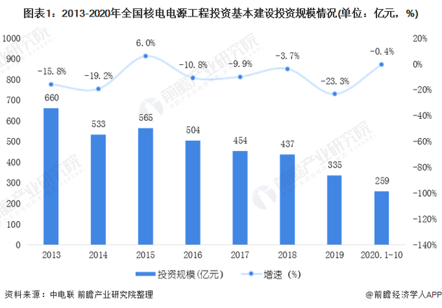 受到福島核電站等事故的影響,我國核電建設雖然處在高速發(fā)展期,但是保持著以“穩(wěn)”為主的基調,新開工機組數量較少,核電工程投資額有所下滑。根據中國電力企業(yè)聯合會的統(tǒng)計數據顯示,2020年1-10月,全國主要核電企業(yè)電源工程完成投資259億元,同比下降0.4%。
