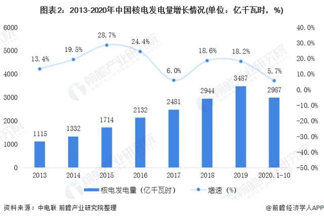 雖然近年來受國家核電批復減少以及新建投資額的降低的影響,我國核電主要企業(yè)電源項目在建規(guī)模有所縮小,但是隨著項目的完工,我國核電裝機規(guī)模不斷擴大,發(fā)電量同步提高。根據中國電力企業(yè)聯合會的數據顯示,2020年1-10月,全國核電發(fā)電量2987億千瓦時,同比增長5.7%,增速比上年同期回落13.6個百分點。