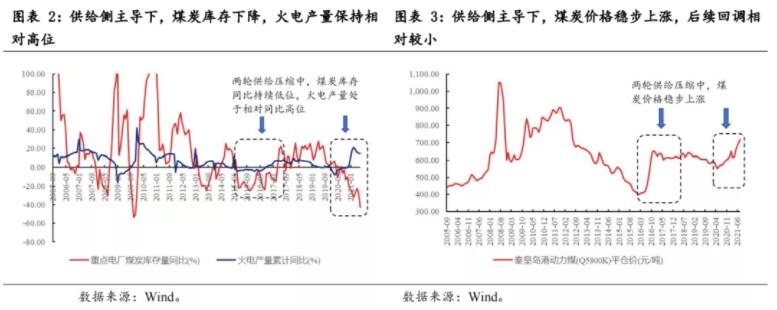 2008年以來,共有三輪煤炭價(jià)格持續(xù)上漲區(qū)間,第一輪的上漲動(dòng)力是中國四萬億刺激政策落地,流動(dòng)性和需求主導(dǎo),第二輪為供給側(cè)改革,供給壓縮主導(dǎo),第三輪為需求復(fù)蘇+供給壓縮主導(dǎo)。