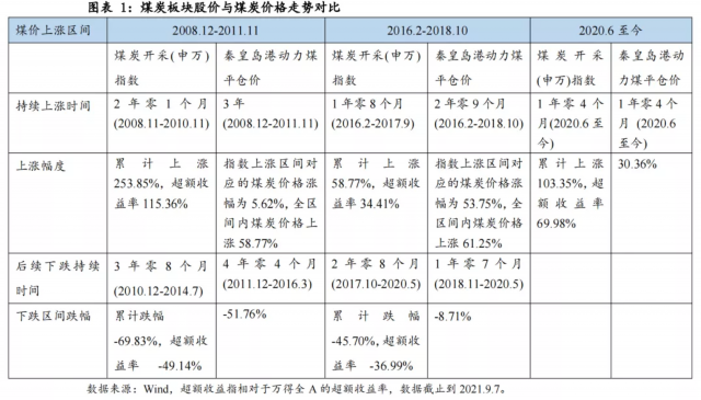 庫存同比低位+火電產(chǎn)量同比相對高位是煤炭價(jià)格和煤炭股啟動(dòng)信號。2016年的煤炭股行情與今年都是在供給側(cè)壓縮下主導(dǎo),在兩輪行情的起步階段,煤炭庫存同比均已經(jīng)過一段時(shí)間的下滑,與此同時(shí),火電產(chǎn)量同比保持在相對高位,如圖2中火電產(chǎn)量同比始終高于煤炭庫存同比。在供給側(cè)主導(dǎo)的行情中,煤炭價(jià)格穩(wěn)步上漲,煤炭股與煤炭價(jià)格的啟動(dòng)時(shí)間同比,煤炭價(jià)格保持在相對高位,煤價(jià)后續(xù)回調(diào)的幅度較小,例如供給側(cè)改革后的2018年11月至2020年5月,煤炭價(jià)格下跌幅度不足10%。
