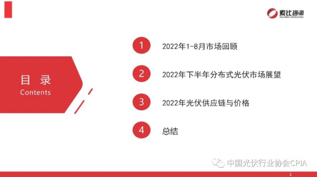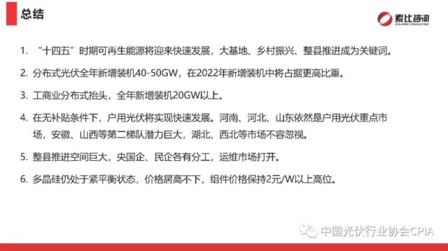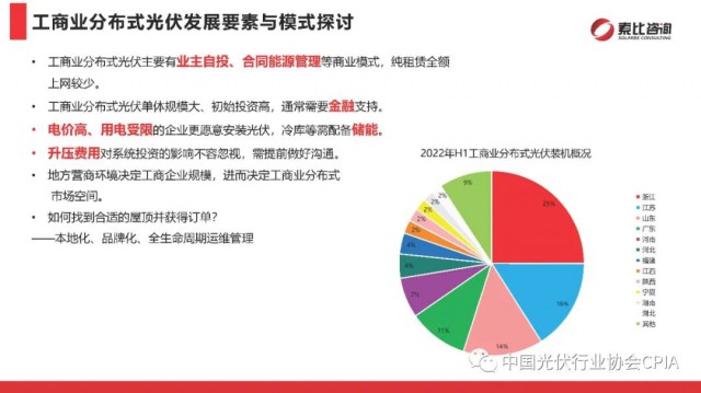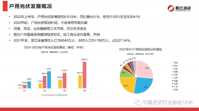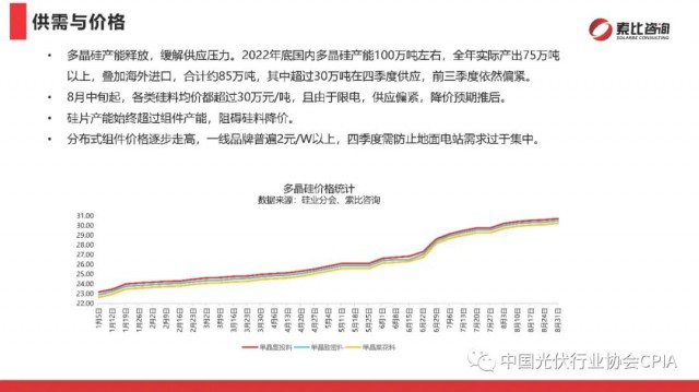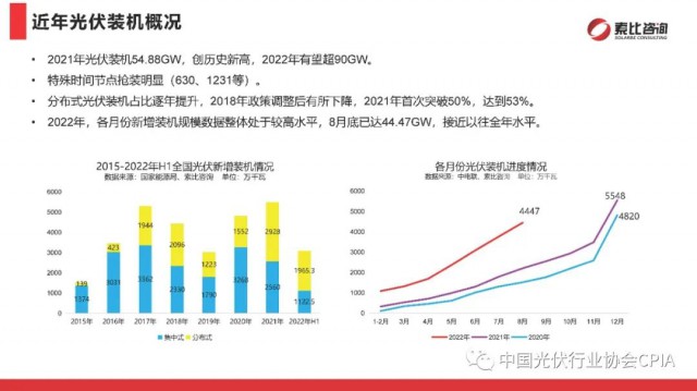 2022年9月27日,在中國光伏行業(yè)協(xié)會(huì)的指導(dǎo)和國內(nèi)領(lǐng)先的分布式戶用企業(yè)支持下,由索比光伏網(wǎng)主辦的“2022年中國戶用光伏品牌大會(huì)暨中東部省份分布式項(xiàng)目開發(fā)研討會(huì)”在浙江寧波召開。索比光伏網(wǎng)副主編尹也澤對光伏供應(yīng)鏈與分布式應(yīng)用市場進(jìn)行了回顧展望。尹也澤副主編分析,整體看,今年全年全國光伏發(fā)電新增裝機(jī)有望超過90GW,其中分布式光伏仍將占據(jù)“半壁江山”。