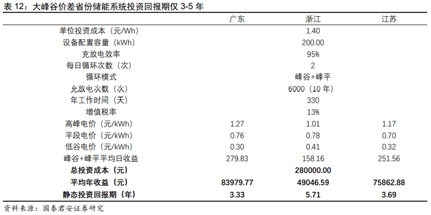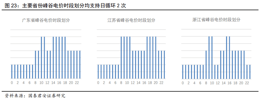 國內(nèi)用戶側(cè)的峰谷電價差套利,我們認(rèn)為主要體現(xiàn)在小工業(yè)和商業(yè)。按照地區(qū)分布,主要是長三角和珠三角。儲能裝置的經(jīng)濟(jì)性體現(xiàn)在兩峰兩谷(平),每天可以有效充放電兩次的區(qū)域,比如廣東、浙江、江蘇等。