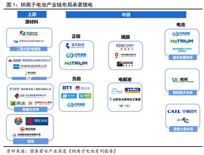 鈉電產(chǎn)業(yè)鏈布局承襲鋰電,利于產(chǎn)業(yè)化快速導(dǎo)入。我國鈉離子電池產(chǎn)業(yè)鏈還處于初級階段,產(chǎn)業(yè)布局尚不成熟。鈉離子電池產(chǎn)業(yè)鏈結(jié)構(gòu)與鋰電類似,包括上游資源企業(yè)、中游電池材料及電芯企業(yè)。