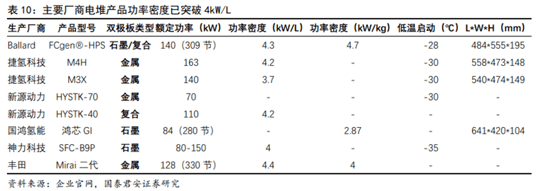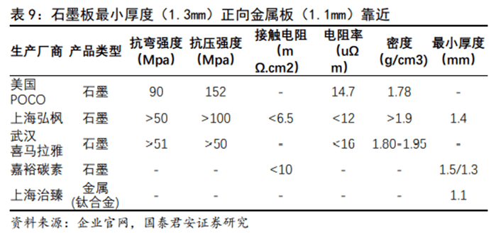 石墨板適應(yīng)需求趨于薄型化,乘用車為金屬板帶來機遇。石墨板:由于其高耐腐蝕性、高耐久性,以及相對較低的技術(shù)壁壘,率先實現(xiàn)國產(chǎn)化,在對體積較不敏感而對耐久性敏感的特種車、商用車領(lǐng)域示范應(yīng)用。然而,石墨雙極板的制作周期長、機械性能差、加工難度大、制作成本高等劣勢也不可忽視。市場已有越來越多的企業(yè)成功開發(fā)出超薄超精細(xì)石墨雙極板,提前突破了國家制定2025年前單組石墨雙極板厚度1.5mm的要求,功率密度開始接近豐田第一代金屬雙極板的水平。金屬板:抗腐蝕性差,壽命過短是其應(yīng)用的阻礙,然而隨著涂層工藝的持續(xù)進步與突破,其有望實現(xiàn)和石墨板相同的使用壽命。豐田汽車公司率先在旗下Mirai燃料電池汽車上使用金屬雙極板和涂層,解決了腐蝕、成本和導(dǎo)電等一系列問題。憑借其機械性能優(yōu)異、高體積功率密度、成本低廉且易批量生產(chǎn)等優(yōu)勢,金屬雙極板將在乘用車規(guī)?;瘧?yīng)用的進程中實現(xiàn)突破。