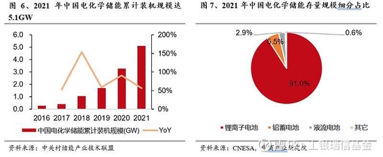 我國電化學(xué)儲能裝機規(guī)模持續(xù)高速增長,其中鋰電池儲能規(guī)模占比超九成。2021年,中國電化學(xué)儲能累計裝機規(guī)模5.1GW,同比增長56.5%,2016-2021年CAGR高達79.3%。其中,鋰離子電池儲能技術(shù)裝機規(guī)模4.7GW,裝機規(guī)模占比91.0%;鉛蓄電池儲能裝機規(guī)模0.3GW,占比5.5%;液流電池儲能技術(shù)裝機規(guī)模0.1GW,占比2.9%。