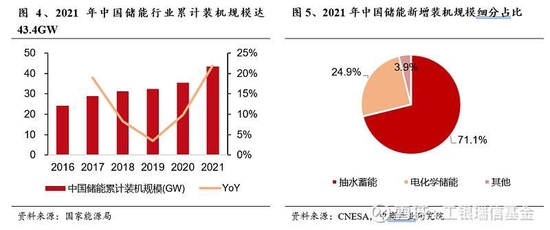 我國儲能市場穩(wěn)步擴容,電化學(xué)儲能份額增長明顯。在新能源發(fā)電規(guī)模大幅增長的推動下,我國儲能裝機規(guī)模一直保持高速增長的趨勢。根據(jù)國家能源局數(shù)據(jù),2021年中國儲能市場累計裝機功率位居全球第一,為43.4GW,同比增長21.9%,2016-2021年儲能累計裝機量年均復(fù)合增長率為12.3%。2021年我國抽水蓄能新增裝機5.2GW,占比71.1%;電化學(xué)儲能新增裝機1.8GW,占比24.9%,較2020年占比9.2%增幅較大,電化學(xué)儲能市場份額增長明顯。