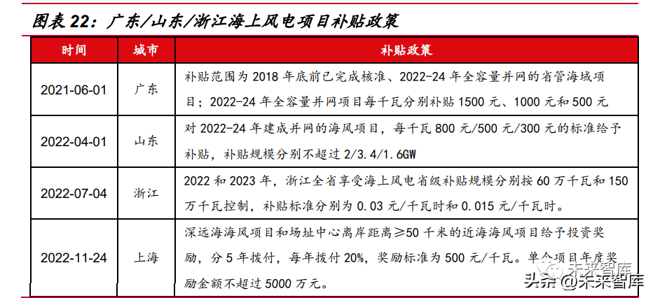 2014-2021 年,海上風電建設享有國家補貼,沿海地區(qū)含稅燃煤電價為 0.37- 0.46 元/度電,而海上風電近海項目補貼后的上網(wǎng)電價在 0.75-0.85 元/度電,高額補貼過去助推了我國海上風電快速發(fā)展。2022 年起國家補貼退坡,開發(fā)商建設意 愿減弱。我們認為國補退出后,我國海上風電主要通過 1)產(chǎn)業(yè)鏈降本;2)地方 補貼支持實現(xiàn)平價并提升項目性價比。