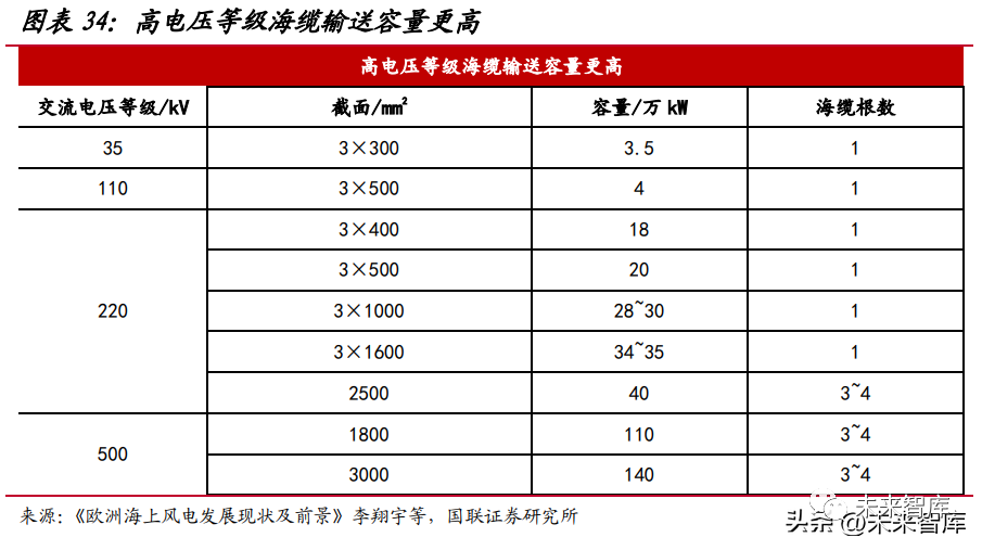 海纜對耐腐蝕、抗拉耐壓、阻水防水等性能要求更高。與陸纜相比,海纜鋪設于 海底,水下情況復雜,需要承受較大水壓,因此必須具有良好的阻水和機械性能,防 止水分滲透導致海纜發(fā)生故障,也需要具備良好的機械性能為、防止船只錨害和洋流 沖刷,此外海纜還需具有防腐蝕、防海洋生物的能力,保障壽命。海纜趨勢一:離岸距離、大兆瓦風機驅動使用高電壓等級海纜。過去國內(nèi)已并網(wǎng) 的海上風電項目離岸距離較近(30km 以內(nèi)),均采用交流海纜送出方式,但隨著風機 大型化、項目向深遠海延伸過去,35kV、110kV 交流海纜受輸送容量限制,同時鋪設 海纜根數(shù)多對海底走廊有很高占用,輸電損耗也較大。同輸電功率的情況下,電壓越高電流就越小,高壓輸電能減少輸電時的電流從而降低因電流產(chǎn)生的熱損耗和降低遠 距離輸電的材料成本。國內(nèi)目前主流交流海纜電壓等級為 220kV,采用單回三芯結構, 輸電能力在 18~35 萬 kW,高電壓等級(更高 220kV、500kV)輸電能力顯著提高。