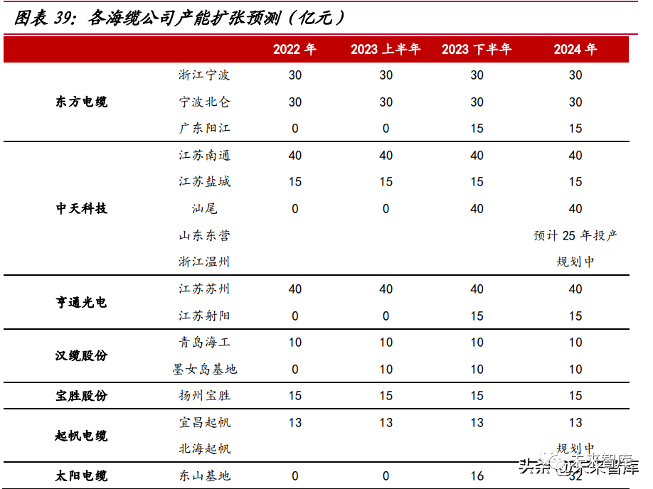 疫情因素減弱,疊加海纜較高的毛利率,海纜企業(yè)擴大產(chǎn)能的動機較強。東方電 纜陽江基地、中天科技(維權)汕尾基地和亨通光電射陽基地 2023 年下半年投產(chǎn),預計分別 擴大產(chǎn)能 15 億、40 億和 15 億;漢纜股份墨女島已建成,投產(chǎn)時間預計在 23 年初, 擴產(chǎn)可達 10 億;太陽電纜正在建設東山海纜生產(chǎn)基地,產(chǎn)能可達 32 億。