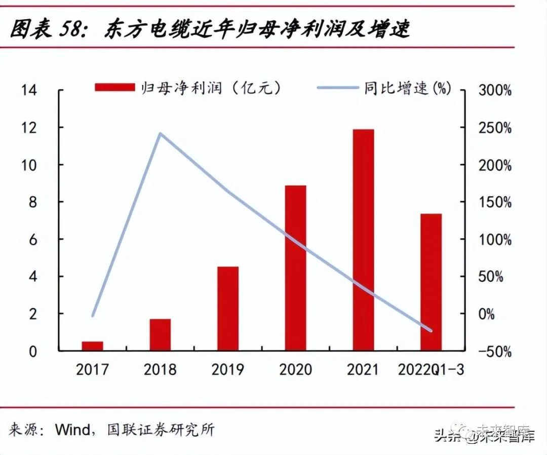產(chǎn)能布局鞏固龍頭地位,在手訂單飽滿。公司積極布局南方市場,位于北侖和陽 江的兩大基地,有望助力公司提升在浙江、廣東等地區(qū)的優(yōu)勢。截至 2022 年 10 月27 日,公司在手訂單 94.4 億元,其中海纜系統(tǒng) 58.1 億元,陸纜系統(tǒng) 23.7 億元、海 洋工程 12.7 億元,同比增加 48%。在手訂單結構中,毛利率較高的海洋板塊占比提 升明顯,未來公司盈利能力有望隨著產(chǎn)品結構改善以及海纜需求回暖迎來提升。我們預計 2022-24 年公司歸母凈利潤分別為 9.61/18.86/23.44 億元(原值為 12.68 /17.46/23.38 億 元 ), 同 比 -19.18%/96.34%/24.26% , EPS 分 別 為 1.40/2.74/3.41 元/股。